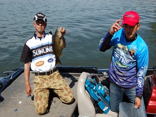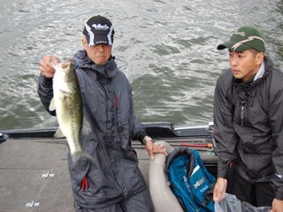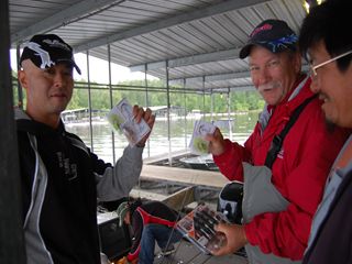 2日間のウェイインのレシートを持って、今日のスモールマウスバスと共に記念撮影。お二人ともお疲れ様でした。11位までの賞金圏内に少し及ばずでしたが、昨日はビックフィッシュ争いに絡んで大健闘でした。 |