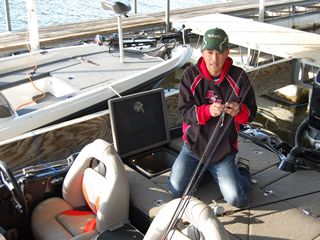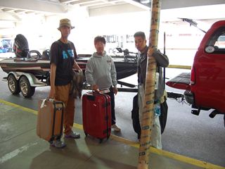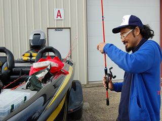 今回、同行取材に来ていただいたルアーマガジン社のマイケル氏もタックルの準備に余念がありません。アメリカに着いて風邪気味のマイケル氏ですが”釣り”という言葉と共に復活?の様子?! |