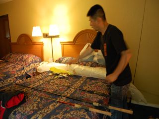 部屋に帰ると荷物のパッキングが待っています。アメリカ土産をたくさん買い込んだので、荷物と格闘中の君和田さん。まだ増える可能性あり??? |