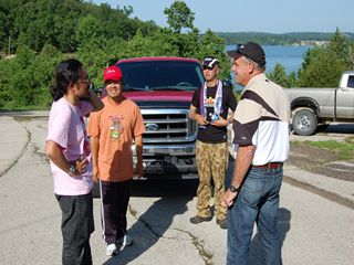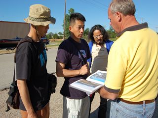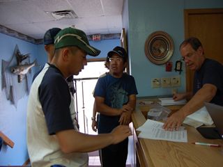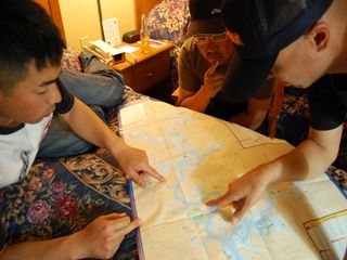バスキャット社番頭ことアイバン氏もどうもジャパンチームのことが心配でしょうがないらしく、彼も釣り人なので最近の釣果を伝えに地図持参で話に来てくれました。 |