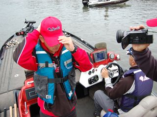 出発のコメントを収録中。雨もやみ、お二人とも気合がはいってます。早いボートナンバーの為、行きたいスポットにも行けるようです。 |
