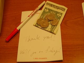 毎日掃除に来る係りの人にチップを置いておく時に、いろんなメッセージを書いていたチームジャパン。返事が係りの人からも書いてあったそうです。 |
