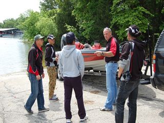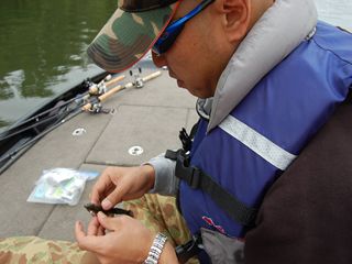 日本チームがロッドを手にリグをさわり始めると、アメリカ人アングラーの視線が熱いぐらいに集まります。日本のルアーや日本の糸の結び方まで興味深く、色々質問が飛び交ってました。 |