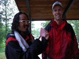 ルアーマガジン編集長マイケル氏もアメリカ人パートナーと共に参戦!今日はバスはラインブレイクなどのハプニングによりウェイインならず、しかし、ビックウォールアイ賞をGETしました。 |