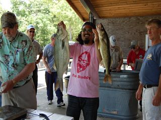 なんとルアーマガジン社マイケル氏はウォールアイのビックフィッシュを、そのパートナーのトッドはストライパーバスでのビックフィッシュを獲得です。アメリカのトーナメントではこんなユニークな賞が用意されているんです。 |