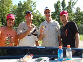 トーナメント2日目朝、バスキャットパーツ担当ピート氏もトーナメントに参戦中。かなり日本のルアーが気になる様で、、、ピートは自作のベリーダンスジグと交換しない?と交渉中。 |
